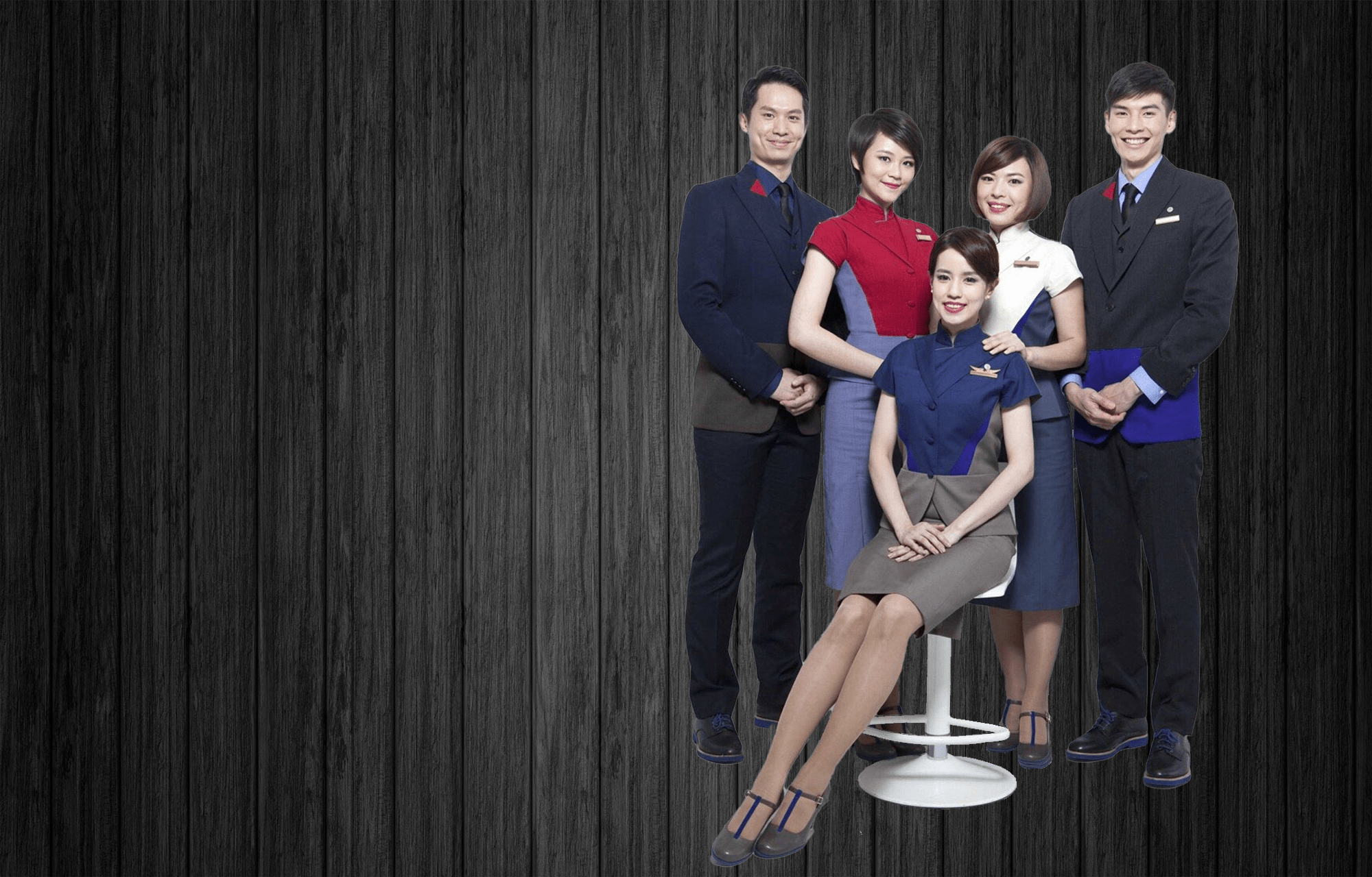 Tailored uniforms and attire for corporate settings, including suits, blazers, shirts, and accessories.